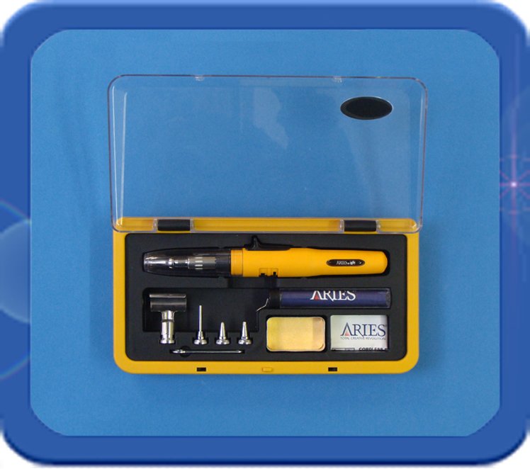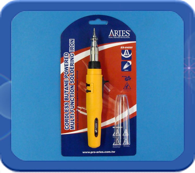 De Aries ES-640KB is een penbrander set met veel extra accessoires. Geschikt voor solderen, buitenactiviteiten, camping, reparaties in en rond huis, laboratoriums, reparatie van elektrische en elektronische circuits, aansluitingen op printplaten, solderen algemeen, reparatie van sieraden en brilmonturen, verhitten en drogen algemeen, buizen en krimpkous opkrimpen, ontdooien van bevroren sloten, lijmen en andere stoffen activeren, Vinyl soepel maken e.d. De brander is voorzien van een pi?zo ontsteking.