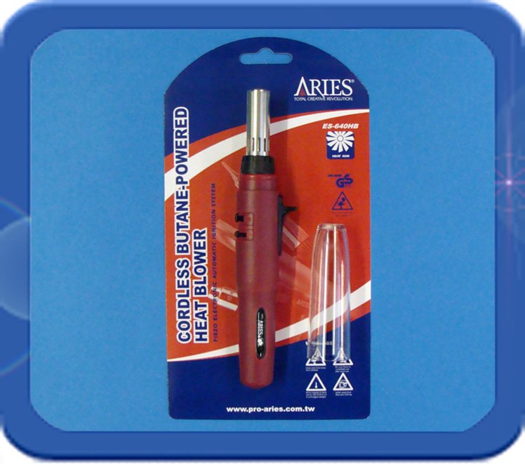 De Aries ES-640HB is een penbrander met hetelucht. Geschikt voor verhitten en drogen algemeen, buizen en krimpkous opkrimpen, ontdooien van bevroren sloten, lijmen en andere stoffen activeren, Vinyl soepel maken e.d. De brander is voorzien van een pi?zo ontsteking.