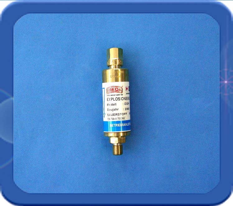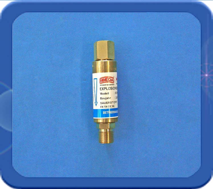 Deze Ibeda vlamdover is geschikt voor montage aan een reduceerventiel met een grote doorlaat. Deze Ibeda vlamdover bevat een vlamdovend element (sinterbrons)en een terugslagklep. Een smeltpatroon is in deze Ibeda vlamdovers niet ingebouwd. Primaire aansluiting is een 1/4"r wartel met bolconus. De secundaire aansluiting is 1/4"r uitwendig met een holconus. De maximaal toelaatbare druk voor zuurstof is 20 bar. Capaciteit bij een voordruk van : 0.3 0.6 0.9 1.5 2.5 5.0 bar is 2.7 5.1 7.6 12.3 18.1 36.2 Nm3/uur De Ibeda vlamdover voldoet aan de in de Europese Norm 730 gestelde eisen.
