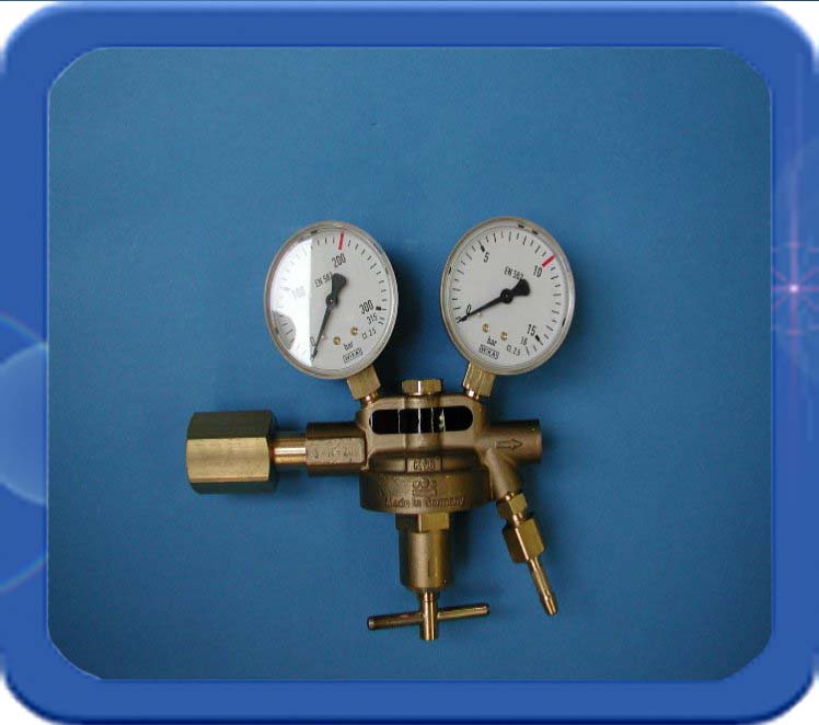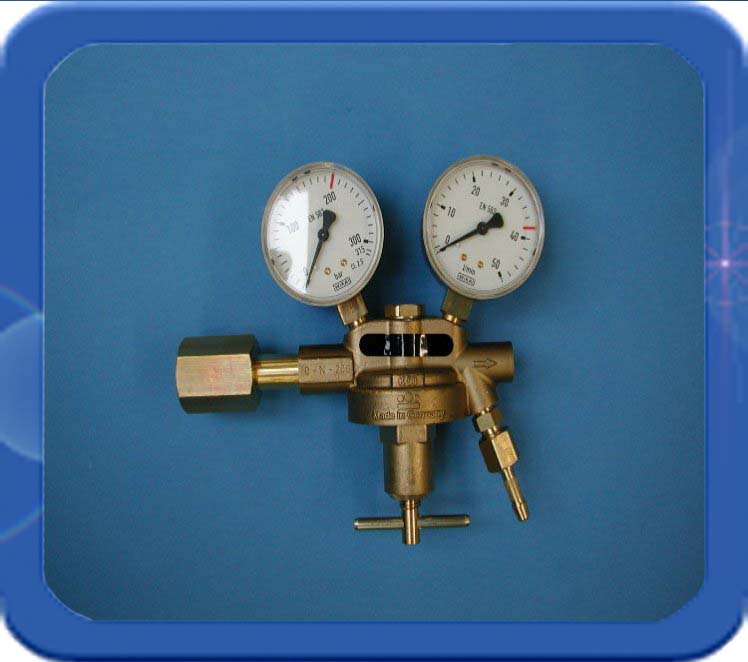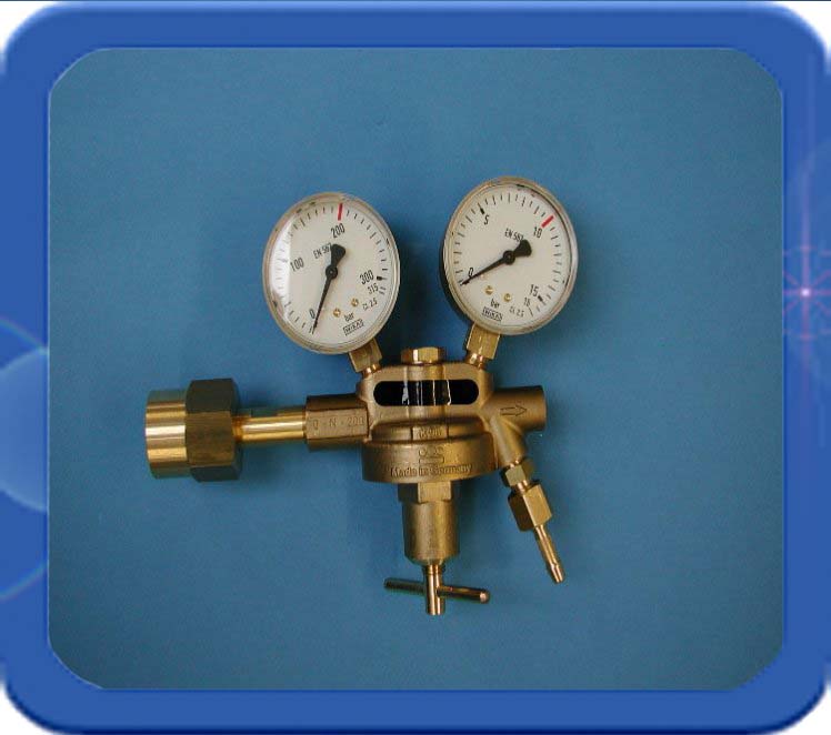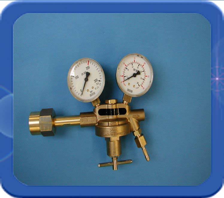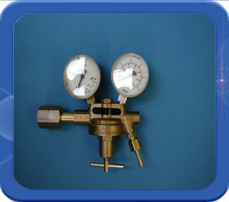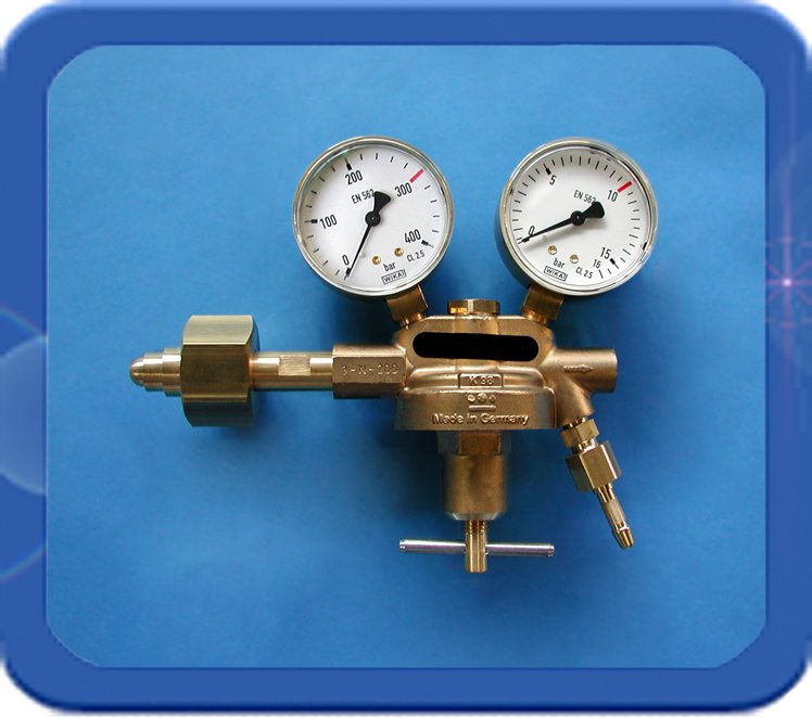 Om de druk van een stikstof cilinder (tot 200 bar) te reduceren naar een werkdruk instelbaar tussen de 0 en 10 bar kunt u dit reduceerventiel gebruiken. De primaire aansluiting is 24.32 R inwendig (voor RU 3 cilinder). De secundaire aansluiting is 1/4"R uitwendig met een slangtule voor een 6 mm slang (EN 560). De manometers rond 63 mm zijn klasse 2.5. Het ventiel is niet voorzien van een zijafsluiter. (tegen meerprijs mogelijk) De afblaasveiligheid staat iets boven de 10 bar afgesteld.
