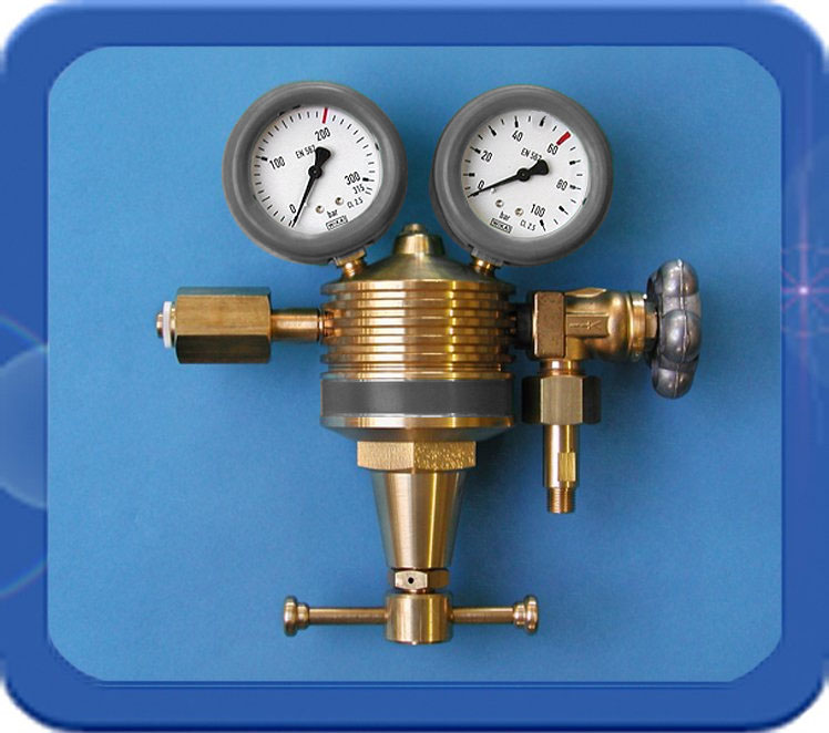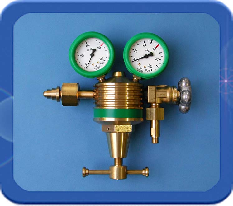 Om de druk van een stikstof cilinder (tot 200 bar) te reduceren naar een werkdruk instelbaar tussen de 0 en 60 bar kunt u dit reduceerventiel gebruiken. De primaire aansluiting is 24.32 R inwendig (voor RU 3 cilinder). De secundaire aansluiting 21.8R uitwendig (RU 1) met een aansluitpen naar 1/4"R uitwendig hol (EN 560). De manometers rond 63 mm zijn klasse 2.5. Het ventiel is voorzien van een zijafsluiter. De afblaasveiligheid staat iets boven de 60 bar afgesteld.